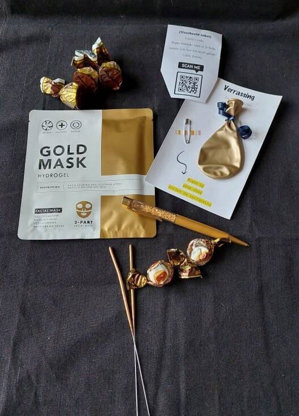 Originele manier om iemand te bedanken. In het doosje zit een gouden maskertje, een gouden pen, heerlijke chocola en een ballon om door te prikken. In die ballon zit jouw persoonlijke boodschap, die ik al voor je heb geprint en erin heb gestopt.